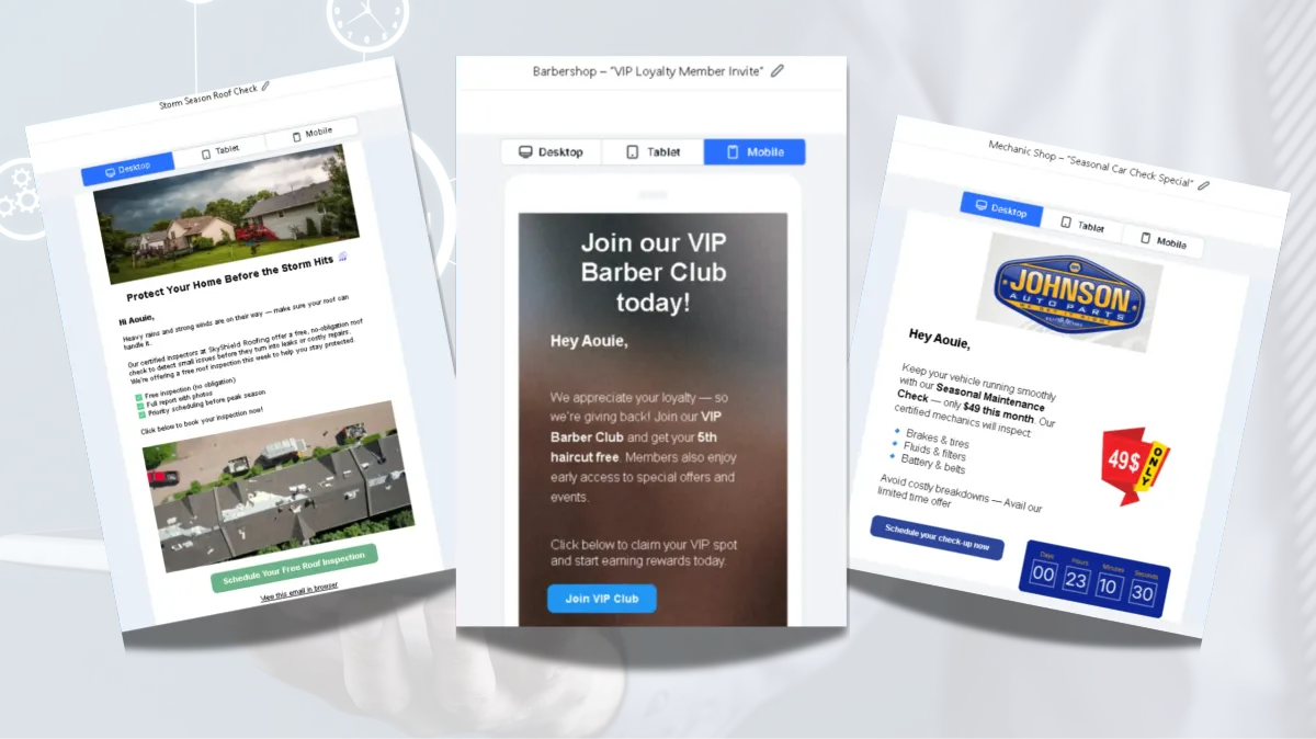 This image showcases three different automated email campaign templates, each tailored for a specific local service business: roofing, barber shop, and automotive maintenance. These campaigns are designed for use with GoHighLevel (GHL), demonstrating how targeted messaging and personalized offers can drive engagement and conversions for varied industries.